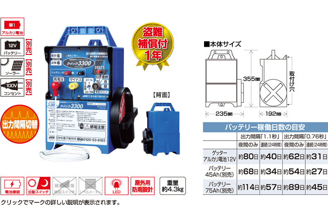 ●別売の「ソーラーセット」「ACアダプター」を使用すればソーラーや100Vコンセントから電源を使うことができます。 ご購入後でも取付けが可能です。