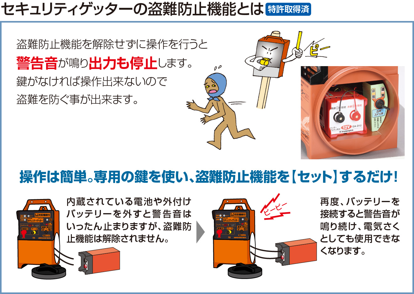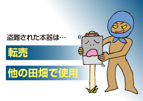 電気さくは害獣の出没しやすい人気のない場所で使用されることが多く、電気さく本器が盗難に遭いそのために通電されずに農作物への被害が報告されています。セキュリティゲッターは、盗難防止機能を備え安心して農業を営めるように日常の管理をサポートします。