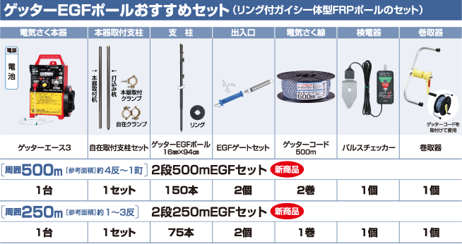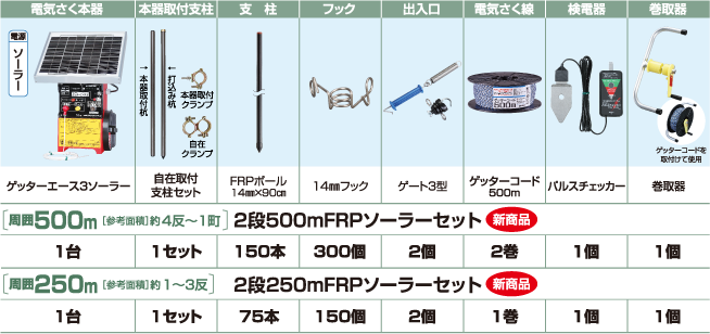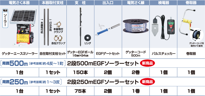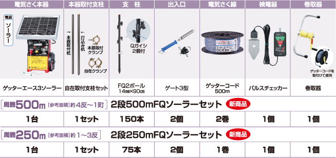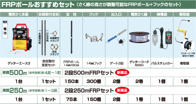 地形や対象動物によって3段張りをおすすめします。 ※段数を増やすと設置できる距離が短くなります。電気さく本器の最大電線長でご確認ください。 イノシシ用の2段張りセットにゲッターコードとフックまたはガイシを追加することで 3段張りにすることができます。